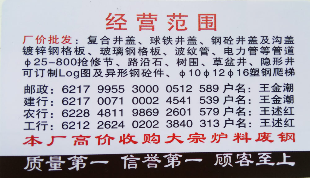 我公司廠家批發(fā):復(fù)合井蓋、球鐵井蓋、鋼砼井蓋及溝蓋鍍鋅鋼格板、玻璃鋼格板、波紋管、電力管等管道?25-800搶修節(jié)、路沿石、樹圍、草盆井、隱形井等,可定制Log圖及異形鋼砼件、?10?12?16塑鋼爬梯等,專業(yè)回收工地鋼筋,高價收購大宗爐料廢鋼。